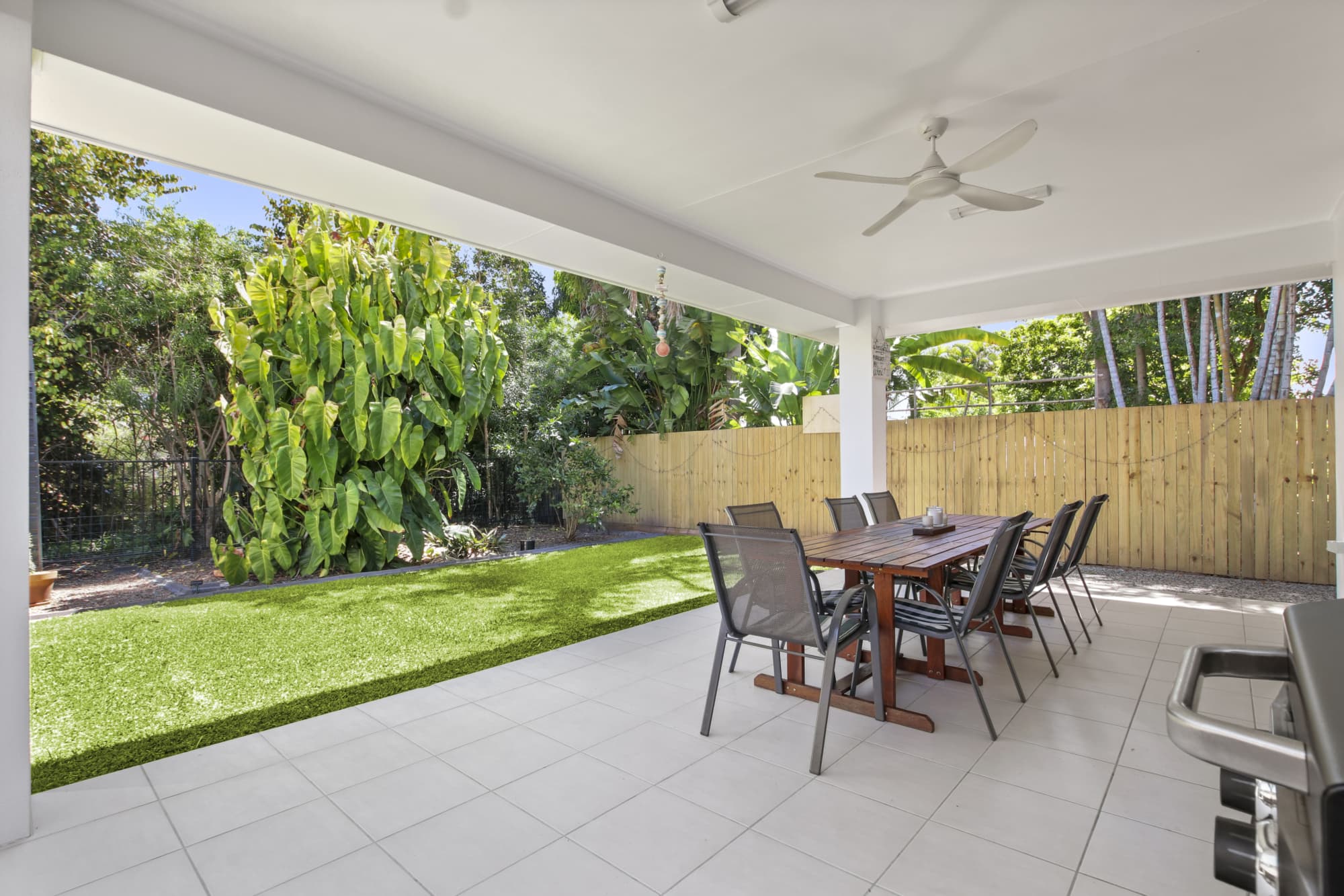 The covered outdoor patio is ideal for long lunches and relaxed dinners, complete with an outdoor setting and Bbq, all overlooking a fully fenced, private yard — perfect for families to spread out and relax.